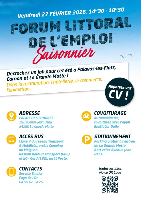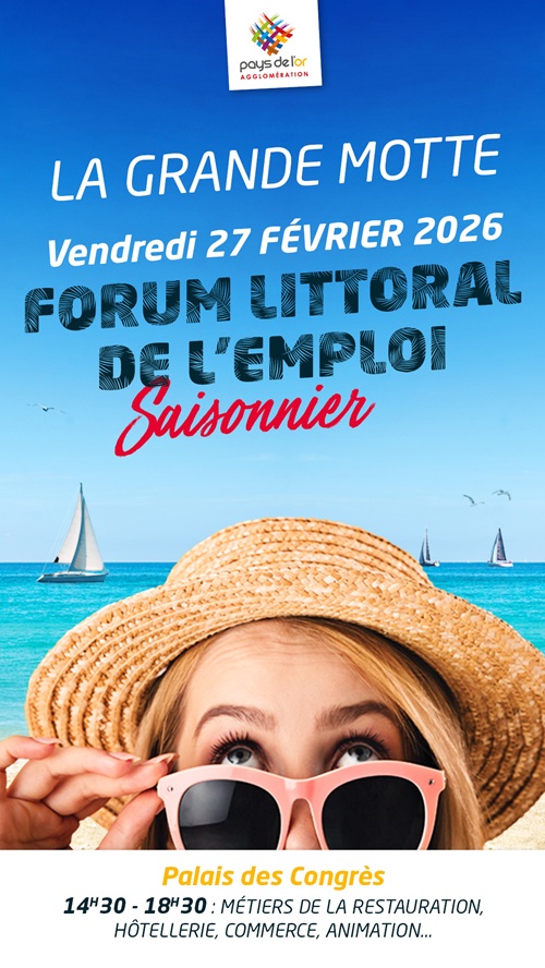 Le Forum Littoral de l’Emploi Saisonnier revient pour la saison 2026 ! Participez à cet évènement incontournable organisé par l’Agglomération du Pays de l’Or le vendredi 27 février, de 14h30 à 18h30, au Palais des Congrès de La Grande Motte.