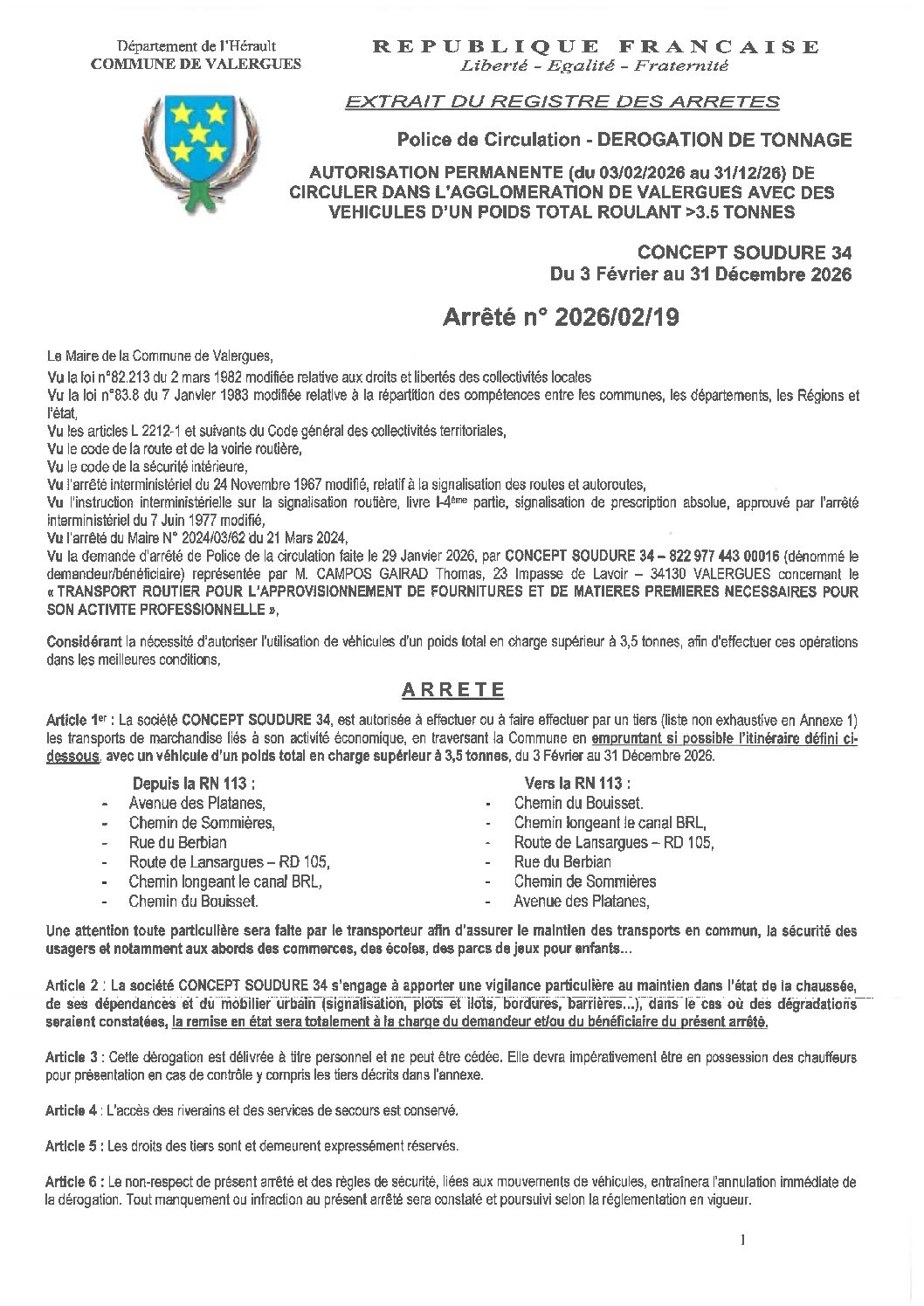 Dérogation de tonnage – Concept soudure 34, du 3 février au 31 décembre inclus